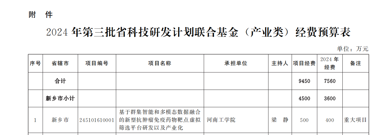 近日,河南省财政厅、河南省科学技术厅联合下发《关于明确2024年第三批省科技研发计划联合基金(产业类)项目经费预算的通知》(豫财科〔2024〕55号),我校作为主持单位申报的《基于群集智能和多模态数据融合的新型抗肿瘤免疫药物靶点虚拟筛选平台研发以及产业化》项目获批立项,资助经费500万元,这是我校在省科技研发计划联合基金(产业类)重大项目申报中首次成功获批。